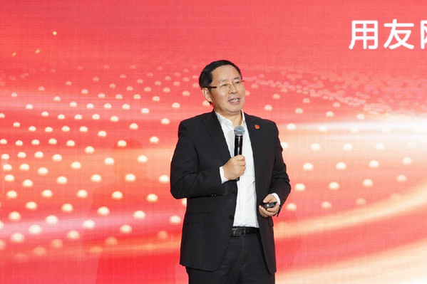 图为用友网络科技股份有限公司董事长兼CEO王文京发表主旨演讲。新华网 王小骥 摄