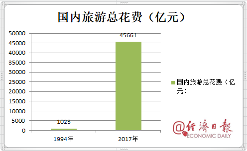 旅游从曾经的“奢侈品”转变为人民日常“生活元素”。2017年,国内旅游总花费45661亿元,比1994年增长了43.6倍。