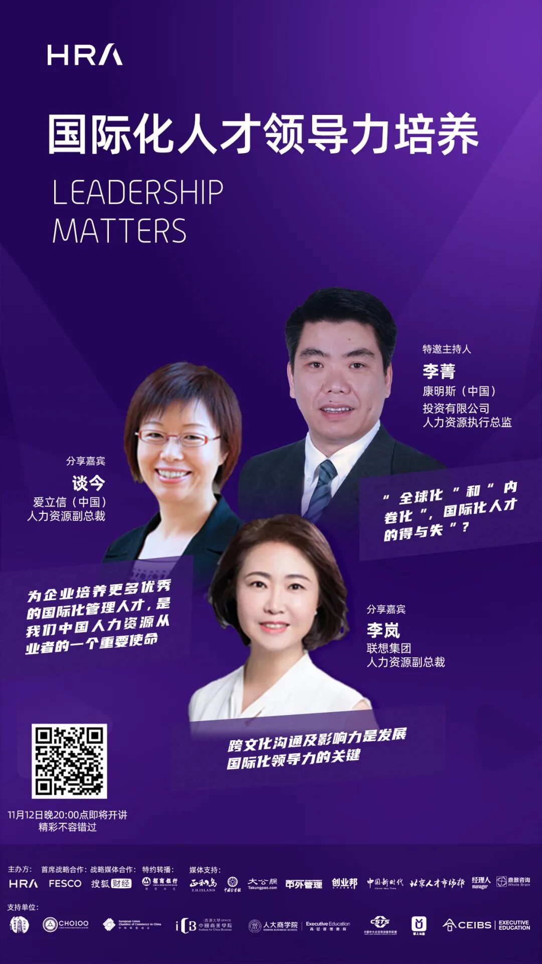 国际化人才需要具备哪些素质? 国际化人才是不是一定要有过留学经历? 身在国内,如何成为成为国际化人才? 11月12日(周四) 晚8:00 由中国中小企业培训服务联盟成员单位HRA主办、FESCO战略合作 及20家合作伙伴联合打造 “人才与领导力 实战·时问”系列活动收官之作 国际化人才领导力培养 从意识、见识、能力三方面解读 如何成为“金字塔尖”的国际化人才 与10万+网友同频互动 管理是一门学问,也是一门艺术,只有充分发挥组织的领导力,才能使企业不断创新发展,也为更多的人提供展示个人领导力的舞台。 在第四期的直播中,嘉宾对领导力做了经典的概括:领导力是德、智、勇,要以德服人、以智取胜、以勇克难;领导力也是真、善、美,要真心相待、心存善意、内心美好。 更多领导力诠释及核心本质探寻 请扫码报名参加直播活动