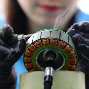 在一家电机制造企业,工人在生产线上工作。新华社发(董军 摄)