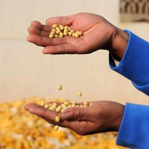 临河区干召庙镇永丰村村民展示清选出的大豆。(新华社记者李云平 摄)