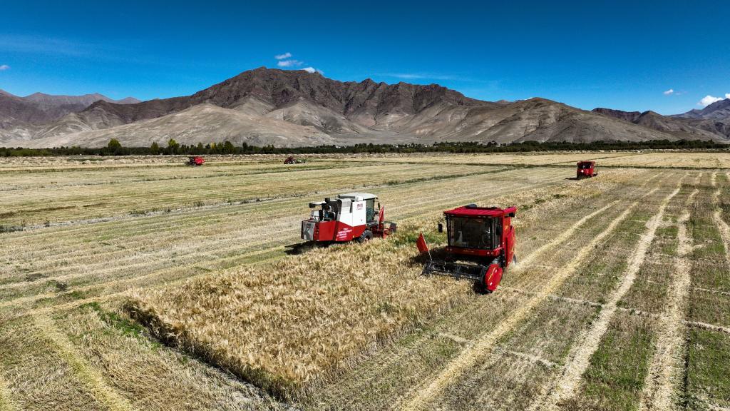 日喀则市江孜县努康村村民在进行机械化收割。新华社记者 晋美多吉摄