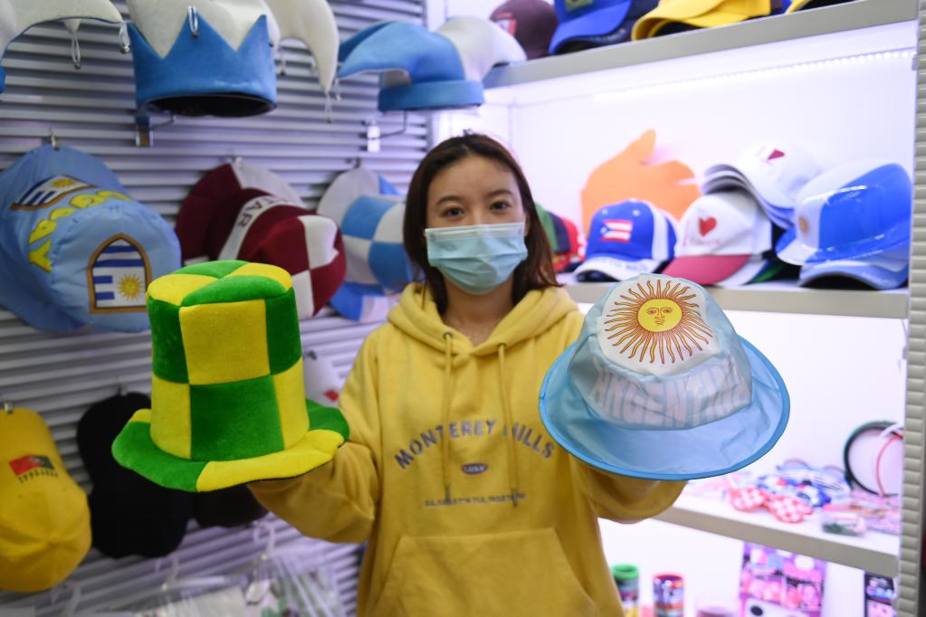 11月17日,在义乌国际商贸城,一家获得官方授权的商户在展示2022年卡塔尔世界杯周边产品。新华社记者 黄宗治 摄