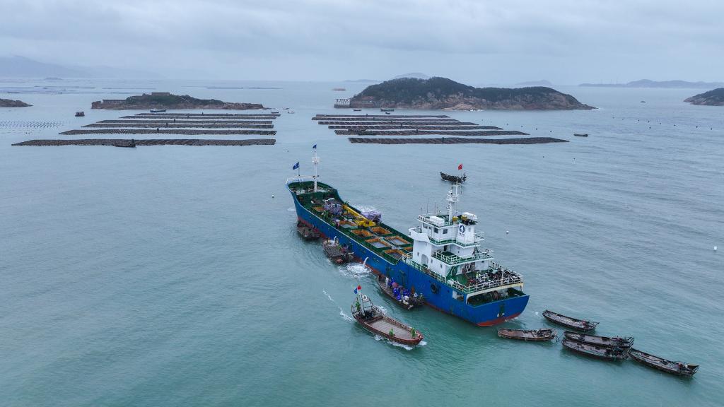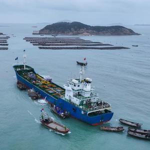 新华社福州11月27日电(记者庞梦霞 周义)近日,福建省连江县苔菉镇后湾海域热闹繁忙,渔民们正忙着将5万多笼鲍鱼从运输船上卸下,再用小船运到渔排上,挂绳下海继续养殖。