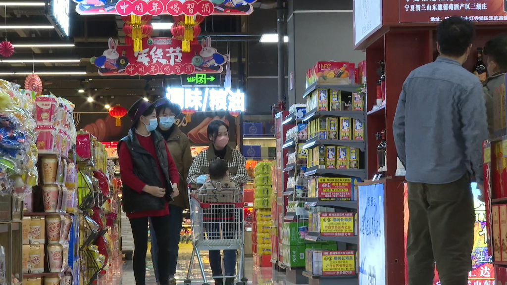 宁夏吴忠市红寺堡区的商超里,各色商品琳琅满目,市民在选购商品。