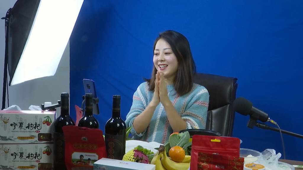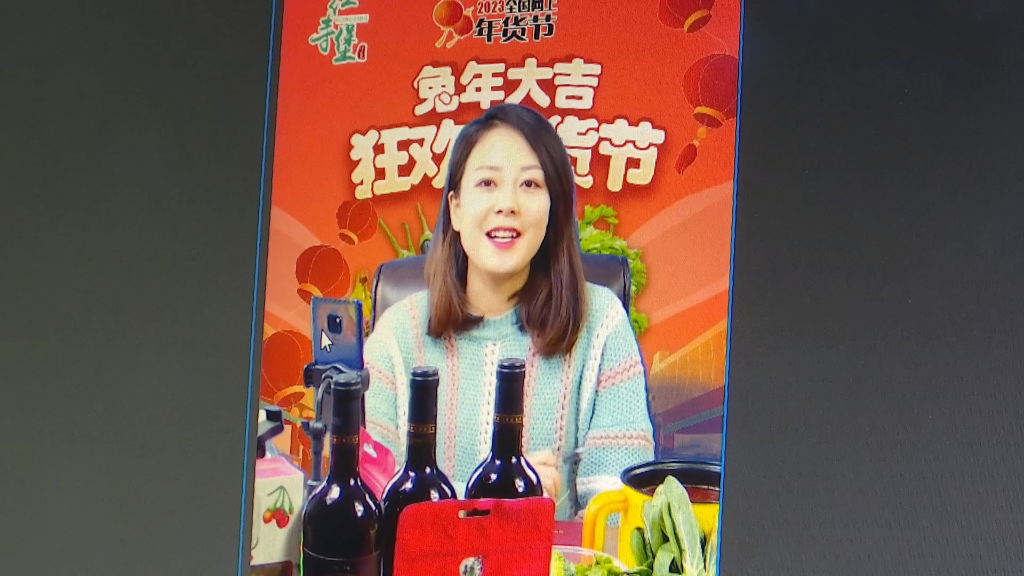 网上年货节直播间里,主播正在直播带货。葡萄酒、黄花菜、枸杞等50多款特色农副产品及生活必需品深受消费者青睐。