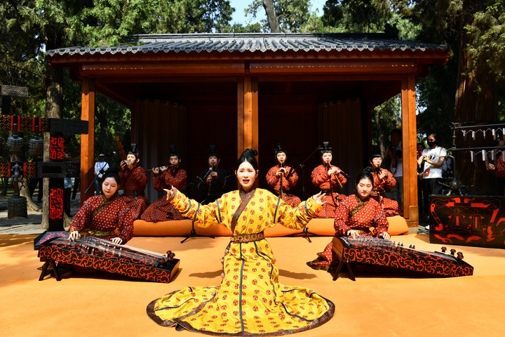 在曲阜孔庙,孔子博物馆礼乐传习所的工作人员进行以《诗经》为主题的雅乐表演。新华社记者郭绪雷 摄