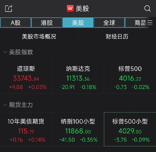 美东时间周三,美股三大指数收盘涨跌不一,道指四连涨,纳指与标普500指数则连续第二个交易日下跌。截至收盘,道指涨9.88点,涨幅为0.03%,报33743.84点;纳指跌20.91点,跌幅为0.18%,报11313.36点;标普500指数跌0.73点,跌幅为0.02%,报4016.22点。
